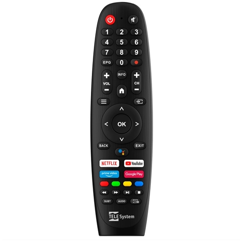 Ersättningsfjärrkontroll för Android TV TELE System-TV-apparater, med Google Assistant-knapp och direktknappar för apparna NETFLIX, YOUTUBE, PRIME VIDEO och GOOGLE PLAY.