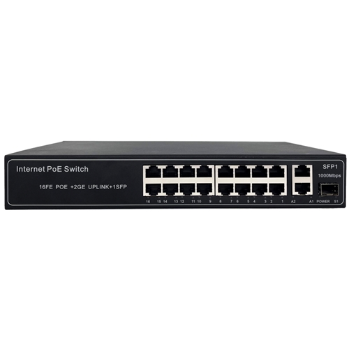 FT-1024-P16-1S is a Gigabit uplink unmanaged PoE switch with 16 100Mbps adaptive RJ45 ports and 2 Gigabit adaptive RJ45 ports.